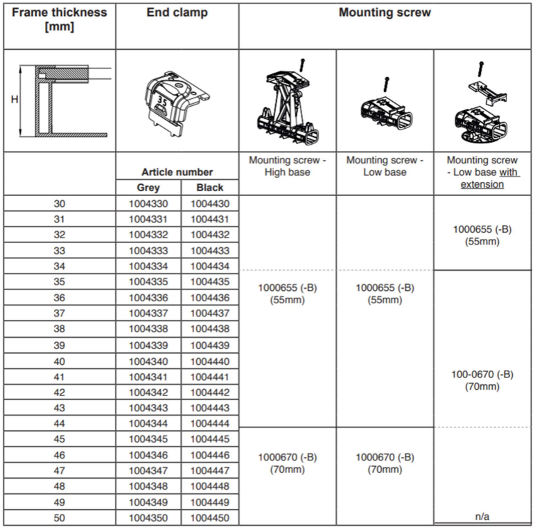 Siehe das Dokument "Application Note Esdec FlatFix Fusion End Clamp Table" für mögliche Kombinationen für verschiedene Module.