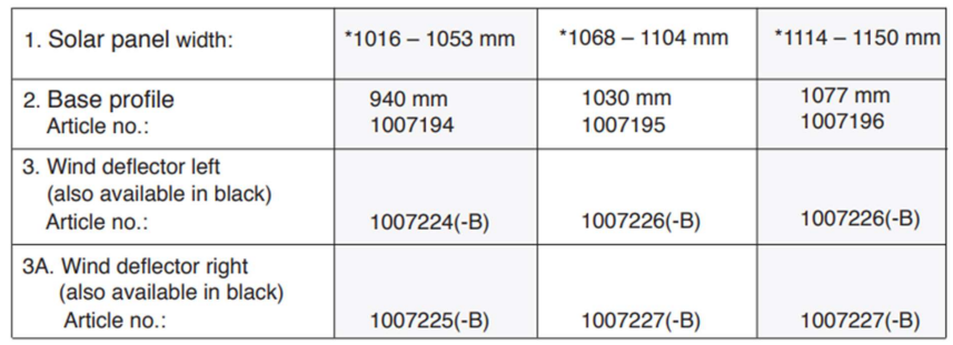 Verschiedene Breitenoptionen für verschiedene Module. Siehe "Application Note FlatFix Fusion Wind Deflector Configurator Table" Dokument zur Überprüfung.